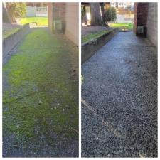 We are excited to share these before and after patio pressure washing pictures with you! This home sits under a number of trees causing parts of it to get very little sunlight. We were able to get rid of the moss that had taken over using our pressure washer and also applied our post treatment solution to help combat against the moss regrowing as fast.